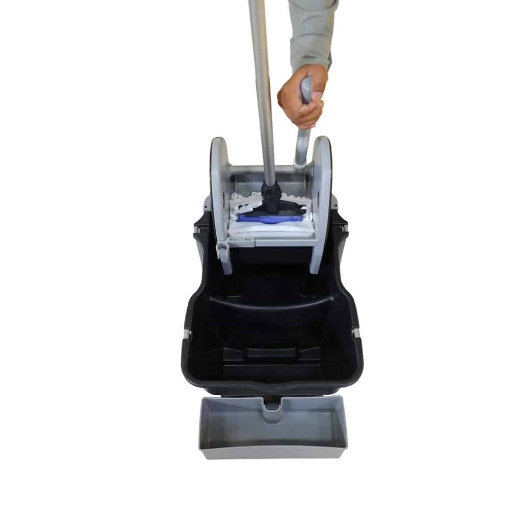 Cuenta con una prensa vertical para exprimir trapeadores de hasta 550 g
