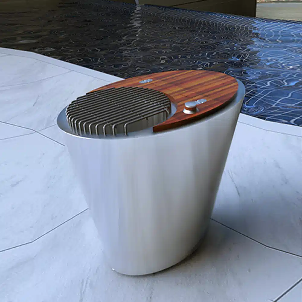 Estructura: Acero inoxidable AISI 304 satinado. Tabla de picar: Madera teca reforestada con bisagras de acero marino. Incluye tanque y regulador de gas interior.