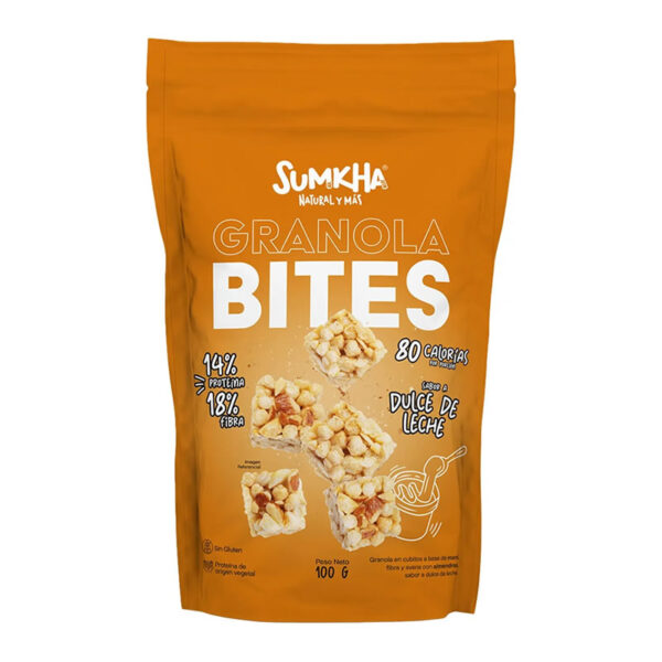 Granola en cubitos a base de maní, fibra y avena con pasas y canela. Sabor a rollo de canela.